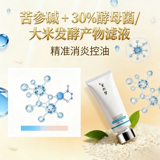 解决了清洁问题,就到了祛痘的核心环节。黛熙梦添加 30% 高浓度酵母菌 / 大米发酵产物滤液(专利成分),搭配苦参碱,形成 “控油 + 杀菌” 双通路,精准针对 “功效与需求错位” 痛点。酵母菌 / 大米发酵产物滤液富含植物多糖、氨基酸等营养物质,能深入调节皮脂腺活性,从根源减少油脂分泌,避免油脂过剩滋养痤疮丙酸杆菌;苦参碱作为天然生物碱,杀菌消炎能力极强,能直接抑制痤疮丙酸杆菌过度增殖,减轻痘痘炎症反应,加速红肿痘痘愈合。